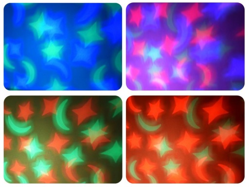 Funkcja projektora w maskotce posiada kolorowe barwy tęczy takie jak: czerwony, różowy, zielony, pomarańczowyczy teżniebieski. Wszystkie kolory przepięknie łączą się ze sobą tworząc magiczną, kolorową krainę. Taki projektor idealnie nada się na nocne usypianie maluszka, aby przełamać półmrok.