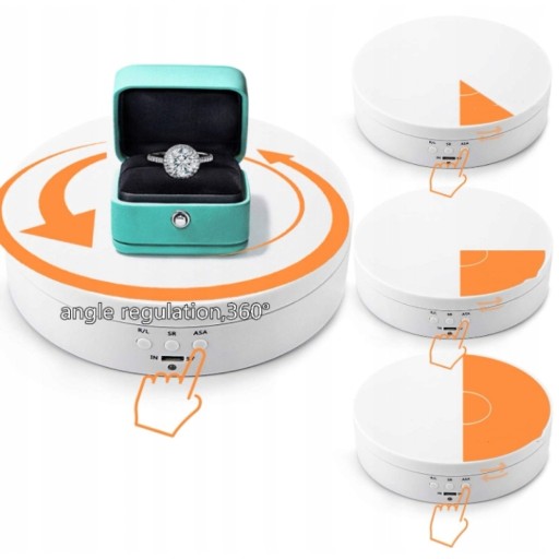 - Obrotowy stojak 3-biegowa ręczna regulacja prędkości, 10/15/30 sekund na okrążenie i wyświetlanie pod 4 kątami - 45°, 90°, 180°, 360°, można dostosować prędkość i kąt do różnych żądania.