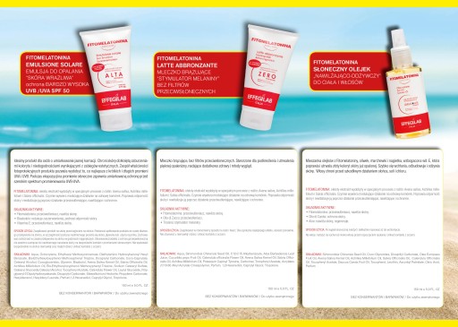FITOMELATONINA LATTE SOLARE BASSA UVB/UVA SPF 10 to rezultat badań firmy Effegilab Italy w trosce o maksymalną ochronę skórę podczas opalania. Ten eliksir przeciwsłoneczny doskonale chroni przed promieniowaniem UVB i UVA oraz dzięki zawartym w nim dodatkowym składnikom gwarantuje znakomitą pielęgnację skóry.