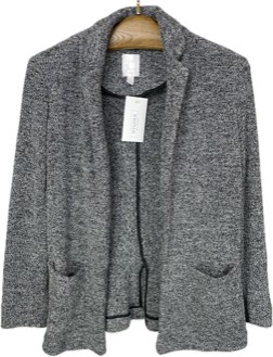- Sweter ma wzór melanżu, w kolorach czerni, bieli oraz szarości. Jest to luźny krój kardiganu. Posiada rozcięcie z tyłu. Dzięki klasycznemu krojowi oraz kolorystyce może być wykorzystywany również jako marynarka do eleganckich stylizacji. Z przodu posiada dwie klasyczne kieszonki. Jest bardzo miły w dotyku, delikatny.