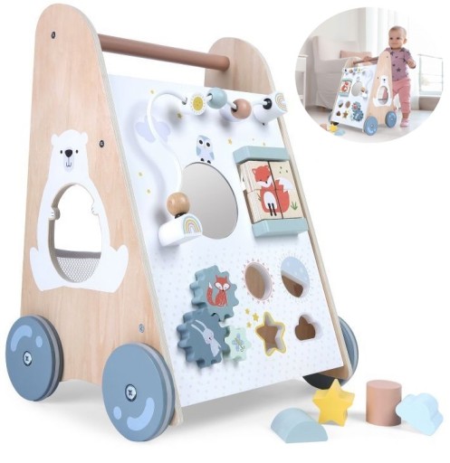 Na froncie pchacza znajduje się wiele zabawek, które rozwiną zdolności manualne Twojego dziecka.