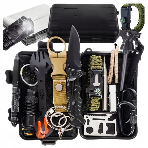 - 32w1 - w zestawie znajduje się: piła strunowa długości ok 60cm, nóż składany z piłą i nożykiem do sznurków, długopis taktyczny, karta przeżycia 11w1, krzesiwo z prętem magnesium i blaszką do krzesania z podziałką w cm i otwieraczem do butelek, latarka - zasilana baterią AA (brak baterii w zestawie), koc termiczny 130x210 cm, zamykany pojemnik do przechowywania, uchwyt na butelkę do paska, opaska paracord - ok. 350 cm linki paracord z kompasem, gwizdkiem i krzesiwem - całość w formie opaski, przynęta silikonowa 2 szt + żyłka + 2 haczyki, niezbędnik - łyżka z widelcem i otwieraczem do butelek + nożyk, składana płomieniówka, sznurek na rozpałkę 2 szt, karabińczyk 2 szt. Jest to bardzo duży zestaw, który pozwala na przetrwanie w bardzo ciężkich warunkach.