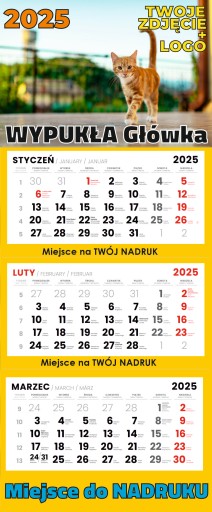 Kalendarz trójdzielny "DUŻY" (na tej aukcji wersja z wypukłą główką) jest drukowany na kartonie 300 g zawiera okienko do oznaczania daty. To idealna propozycja dla tych, którzy potrzebują solidnych i ładnych, ale tanich kalendarzy. Kalendarz posiada 3 oddzielne kalendaria (na miesiąc obecny, poprzedni i następny), przytwierdzone są do plecków.
