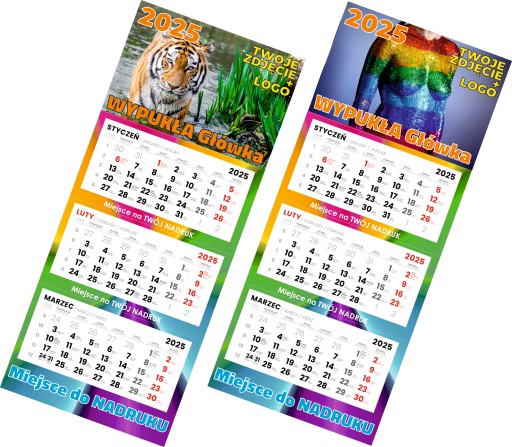 Kalendarz trójdzielny "DUŻY" (na tej aukcji wersja z wypukłą główką) jest drukowany na kartonie 300 g zawiera okienko do oznaczania daty. To idealna propozycja dla tych, którzy potrzebują solidnych i ładnych, ale tanich kalendarzy. Kalendarz posiada 3 oddzielne kalendaria (na miesiąc obecny, poprzedni i następny), przytwierdzone są do plecków.