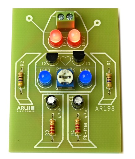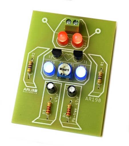 Migający gadżet - zabawka, idealny dla początkujących elektroników, pragnących poznać podstawy elektroniki i lutowania. Układ działa na zasadzie multiwibratora tranzystorowego, który naprzemienne gasi i zapala pary różnokolorowych diod LED, tworząc efekt świetlny małego robota. Prędkość zapalania/gaszenia można regulować w szerokim zakresie, za pomocą potencjometru montażowego. Układ jest idealny dla początkujących elektroników. Pozwala on na zaznajomienie się z podstawowymi elementami elektronicznymi, takimi jak rezystory, kondensatory, tranzystory, diody świecące LED, a także z budową podstawowych obwodów elektronicznych. To zestaw idealny na prezent dla młodego elektronika.