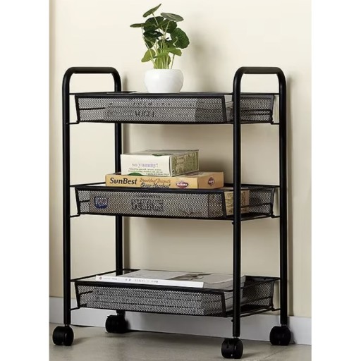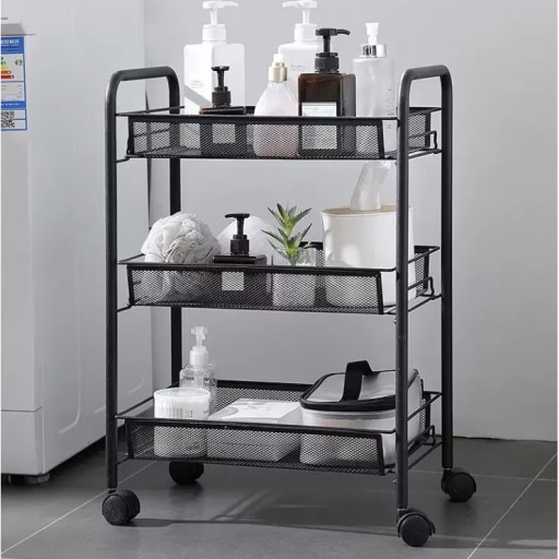 • WYTRZYMAŁA KONSTRUKCJA Z WYSOKIEJ JAKOŚCI ŻELAZA - regał mobilny wykonany jest z trwałego i solidnego żelaza, malowanego proszkowo na elegancki, czarny kolor. Żelazo gwarantuje odporność na korozję i uszkodzenia, co sprawia, że regał jest trwały i idealnie nadaje się do codziennego użytku w różnych warunkach, zarówno w kuchni, łazience, jak i w biurze. Malowanie proszkowe dodatkowo chroni powierzchnię, nadając jej estetyczny, matowy wygląd.