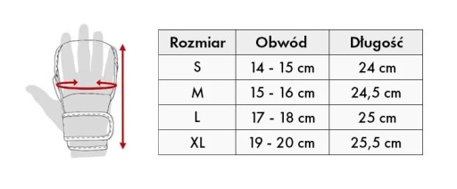 W przypadku stosowania pod rękawice MMA owijek bokserskich należy dodać do szerokości dłoni ok. 0,5 cm.