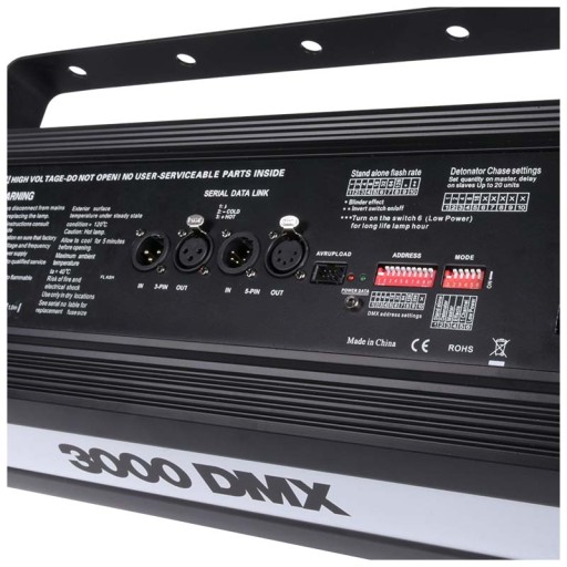 Łatwa obsługa i jakość Light4MeStroboskop Light4Me Strobe 3000W posiada solidną, metalową obudowę odporną na wysokie temperatury powstające w wyniku pracy lampy błyskowej, co gwarantuje duże bezpieczeństwo podczas użytkowania reflektora. Łatwość obsługi zapewniają 3- oraz 5-stykowe złącza XLR pozwalające na sterowanie pracą palnika stroboskopowego za pomocą protokołu DMX, a także wygodne w użyciu przełączniki dip-switch pozwalające na manualne sterowanie jednostką, jej adresowanie i wybór trybu pracy. W trybie DMX do dyspozycji mamy 3 lub 4 kanały odpowiedzialne m.in. za częstotliwość fleszowania i czas trwania pojedynczego błysku. Dzięki temu z łatwością stworzymy efekt klatkowania obrazu w dyskotece albo na techno-party lub burzowe błyski w teatrze albo na planie filmowy (funkcja Random). Możliwości programowalne reflektora rozwija dodatkowo 6-stykowe złącze AVR.
