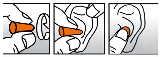 ▶️ Prawidłowe włożenie zatyczek polega na sięgnięciu nad głową wolną ręką, podciągnięciu ucha do góry i włożeniu zatyczki głęboko do kanału słuchowego.