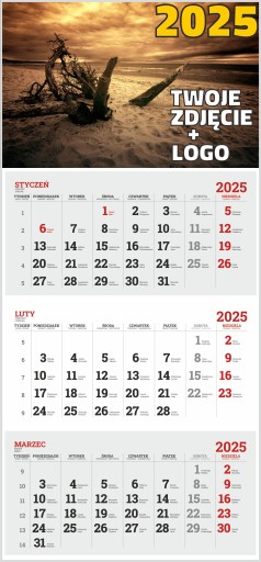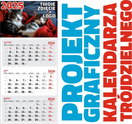 Wśród naszych innych ofert możesz dokonać zakupu usługi wykonania projektu kalendarza trójdzielnego. Taki projekt będzie można wykorzystać przy druku kalendarzy zakupionych na niniejszej ofercie. Naszych klientów obsługujemy kompleksowo - od projektu po druk.