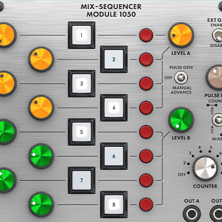 MIX-SEQUENCER MODULE 1050 to klasyczny 8-kanałowy mikser/sekwencer. Model 1050 umożliwia szybki wybór przebiegów i sygnałów za pomocą konwencjonalnego formatu miksera. Każde wejście audio jest wyposażone we własne pokrętło tłumika i przyciski włączania/wyłączania kanałów, których można użyć do miksowania i/lub bramkowania wejścia. Kontrolowanie i zmienianie sekwencji w locie nigdy nie było tak proste! Pokrętła tłumika są nawet oznaczone kolorami w dwóch grupach po cztery kanały, które są powiązane z odpowiednią główną kontrolą wzmocnienia. Możesz używać 1050 jako 8-wejściowego miksera z dwoma regulowanymi wyjściami lub jako dwóch oddzielnych 4-wejściowych mikserów. Używając 1050 jako sekwencera, możesz wybrać pomiędzy pojedynczym 8-krokowym sekwencerem lub podwójnym 4-krokowym sekwencerem, co zapewnia najwyższą elastyczność.