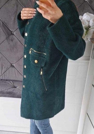 Długi płaszcz z alpaki ze złotymi napami - butelkowa zieleń