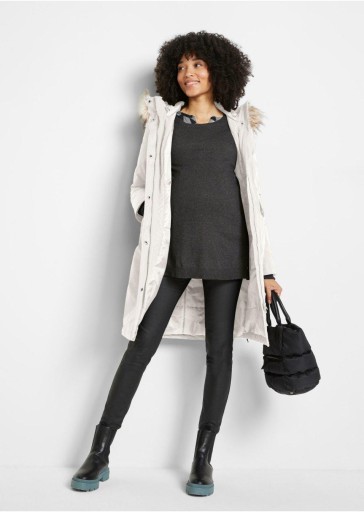Informacje dodatkowe: Wymiary Szer. w pasie/biodra(x2):54/64 Model z nieocieplaną podszewką i odpinaną wstawka dla dziecka zapinany na zamek kryty plisa z napami ,odpinany kaptur ,