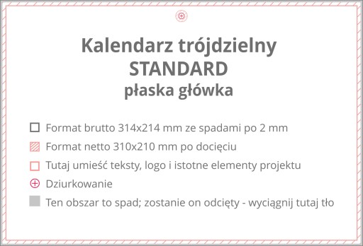 Główka tego kalendarza jest płaska. Jej wymiar wynosi 310 x 210 mm. Należy pamiętać, że tylko na główce można przygotować indywidualny projekt.