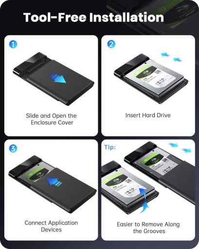 - 2024 Nowa obudowa dysków twardych: Krok 1 przesuwa się w obudowie, krok 2 umieszcza dysk twardy w obudowie dysku twardego i mocno ją wpycha, krok 3 przesuwa obudowa zamknięta wzdłuż torów osłon. Porada: Podczas usuwania dysku twardego podnieś się wzdłuż dolnego rowka, aby usunąć dysk twardy.