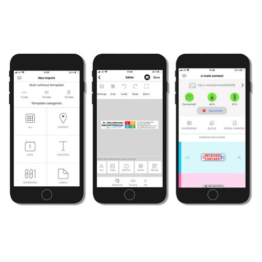Aplikacja e-mark jest wyposażona w gotowe projekty, z których każdy może być edytowany. Dodatkowo, istnieje możliwość stworzenia nowego projektu, zawierającego tekst, grafikę, QR kod, kod kreskowy a nawet numerator czy datownik.Aplikacja umożliwia wysłanie projektów bezpośrednio do urządzenia oraz dodanie trzech wzorów do jego pamięci. Wówczas urządzenie e-mark nie wymaga łączenia się z aplikacją aby wykonać nadruk jednego z trzech zapisanych projektów.