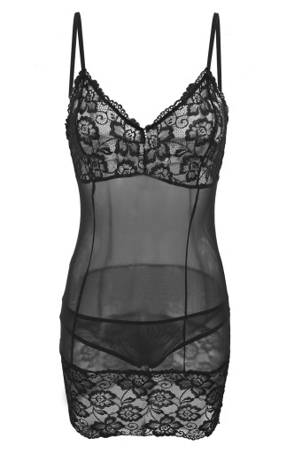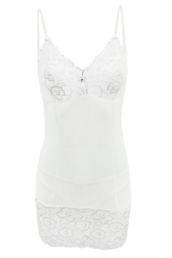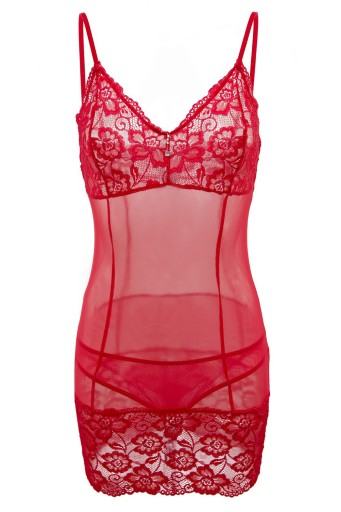 KOMPLET SKŁADA SIĘ Z KOSZULKI ORAZ FIG, PRZÓD TWORZĄ PROFILOWANE MISKI Z KORONKI, DÓŁ RÓWNIEŻ OZDOBIONY KORONKĄ, Z PRZODU BIŻUTERYJNA ŁEZKA.