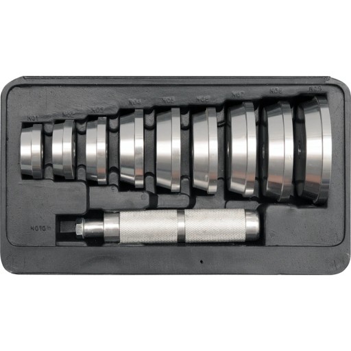 Przeznaczony do montowania uszczelek, simeringów oraz łożysk w gniazdachZestaw umożliwia równomierne wprasowanie łożyska lub uszczelniacza w gniazdo, zabezpiecza przed zaklinowaniem ciasno pasowanych elementówUżycie młotków do pobijania rękojeści może spowodowac powierzchowne wgniecenia i uszkodzenie powierzchni dysków ale nie spowoduje uszkodzenia łożyskaZestaw składa się z aluminiowych dysków o średnicy od 40 do 81mm oraz rękojeści mocowanej w każdym z dysków Dyski posiadają stożek dopasowany do profilu simeringów oraz do średnicy pierścienia zewnętrznego w łożysku W zestawie dyski o średnicy: 40 44 50 59 63 65 72 76 81 mm