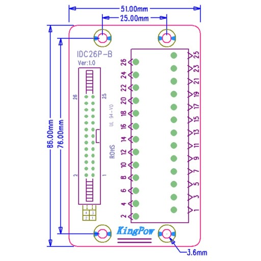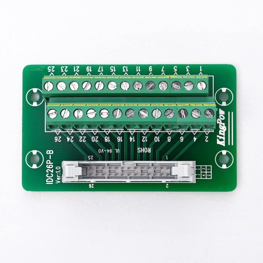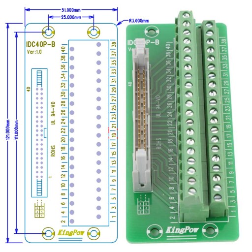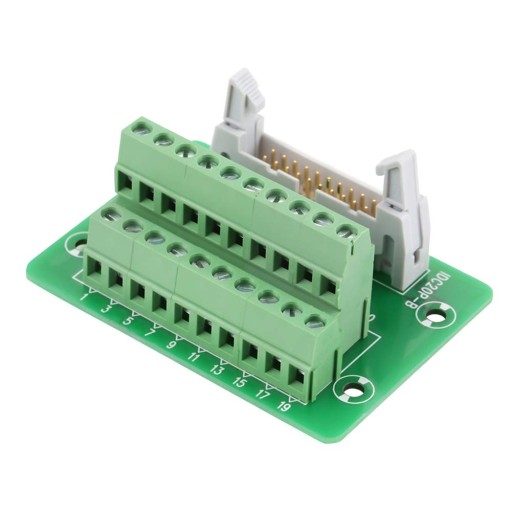 - 40 pinów (2 x 20) o rozstawie 0,1": Ta płytka IDC40 umożliwia wyprowadzenie wszystkich 40 pinów męskiego dwurzędowego złącza na zaciski śrubowe. Każdy pin jest również wyprowadzony na pady lutownicze (3 na pin) w odstępach 0,1" (2,54 mm), co pozwala na łatwe dodawanie nagłówków pinów.