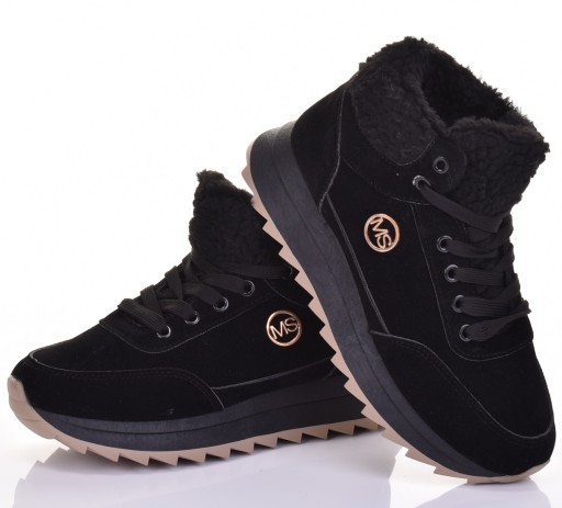 Wnętrze butów ocieplone jest puszystym, bardzo przyjemnym w dotyku futerkiem. Sezonowy klimat obuwia dopełnia cholewka ozdobiona kożuszkiem.
