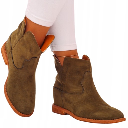 Damskie botki zamszowe eleganckie w kolorze zielonym. Posiada w środku ukryty koturn. ❄ Stabilna, gruba podeszwa dobrze amortyzuje stopę oraz chroni przed zimnem.❄ Wykonane z dobrych jakościowo materiałów. Prosty fason sprawia, że pasują do wielu stylizacji.