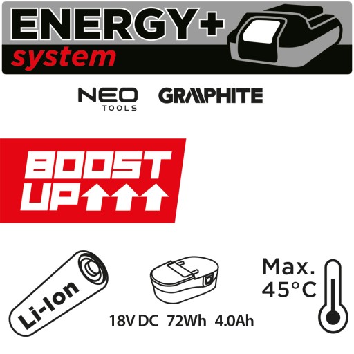 Do urządzeń z serii Energy+ marek GRAPHITE i NEO TOOLS, gwarantuje nieprzerwaną pracę dzięki napięciu 18 V i imponującej pojemności 4 Ah.