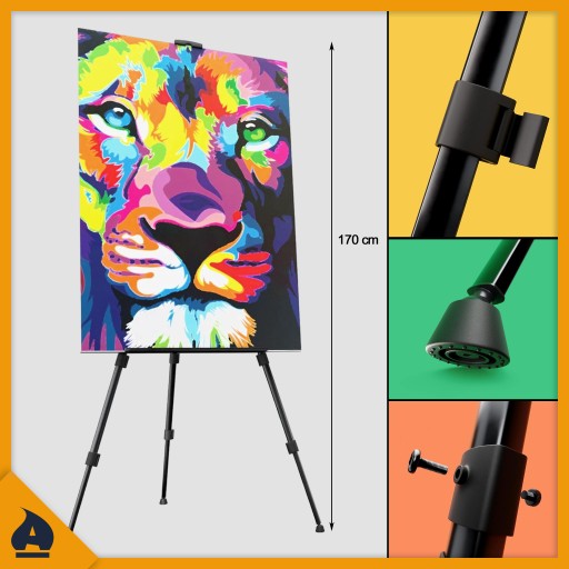 ☑️ Sztaluga: Aluminiowa, minimalna wysokość 50 cm maksymalna 170 cm, maksymalna wysokość obrazu 85 cm.
