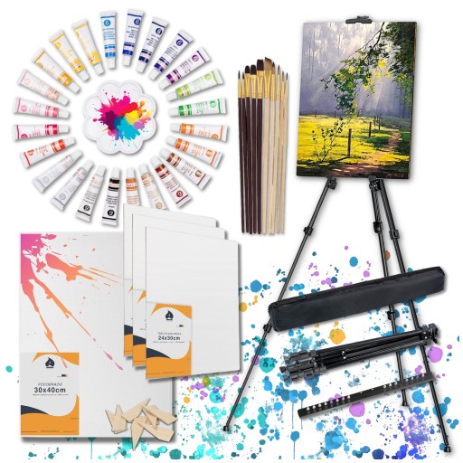 ❤ Zestaw malarski Arcydziele zawiera wszystko, co niezbędne do rozpoczęcia przygody z malarstwem. Stabilna sztaluga, 3 tablice malarskie 24x30 cm, podobrazie 30x40 cm, zestaw farb akrylowych i różnorodne pędzle.