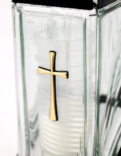 ✨ Elegancki znicz, pewna marka i pewna jakość. Znicz szklany z plastikową tabliczką, z ozdobną z różą i krzyżem. Znicz posiada plastikową podstawką i kapturek w kolorze czarnym.
