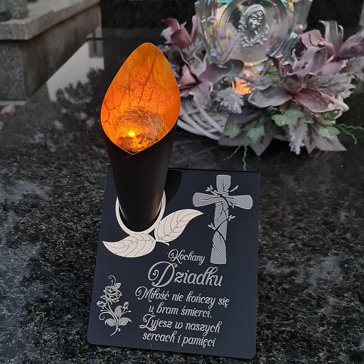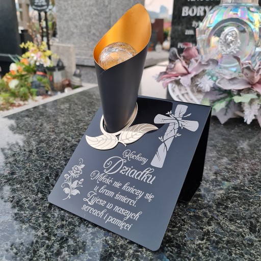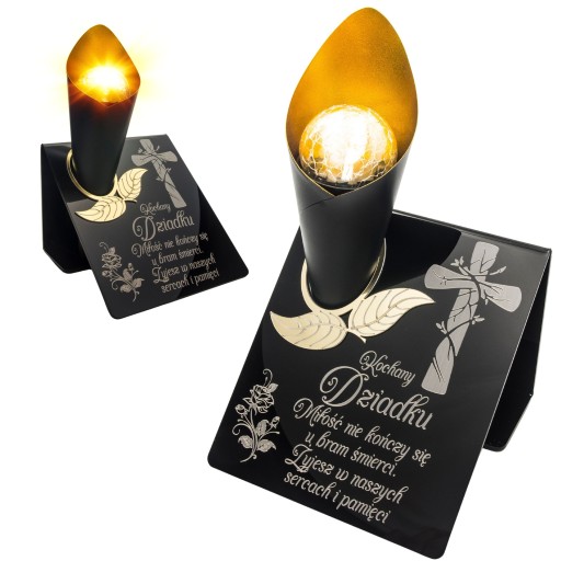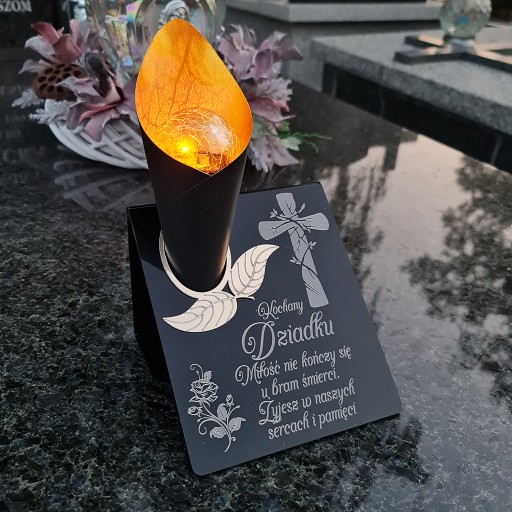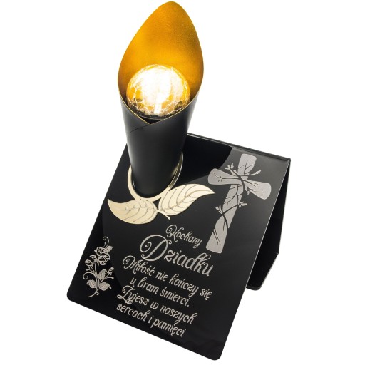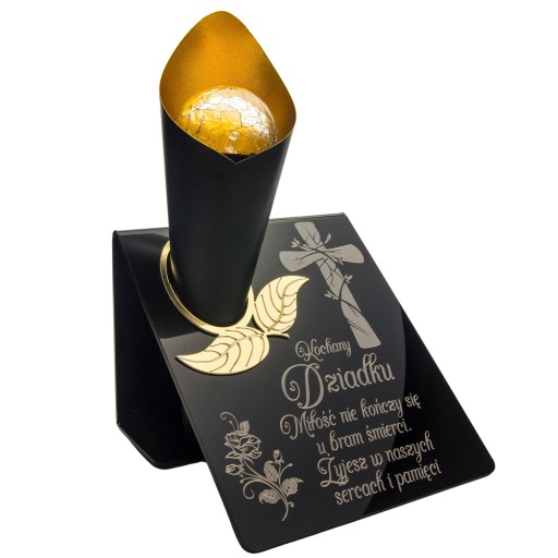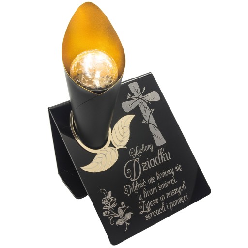 WIECZNY ZNICZ SOLARNY NA GRÓB Z GRAWEROWANĄ PODSTAWKĄ ZE SZKŁA AKRYLOWEGO OZDOBIONA ZŁOTYMI LISTKAMI