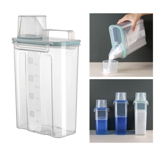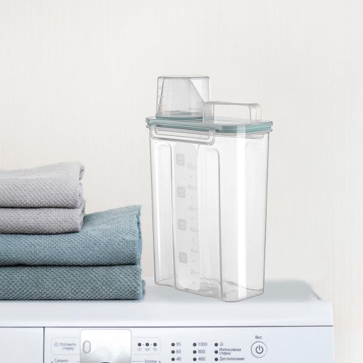 [Rozważny projekt]: korpus i pokrywa dozownika proszku do prania są oznaczone skalą ułatwiającą pomiar. Beczka do przechowywania ma górny uchwyt, dzięki czemu można ją nosić w dowolnym miejscu.