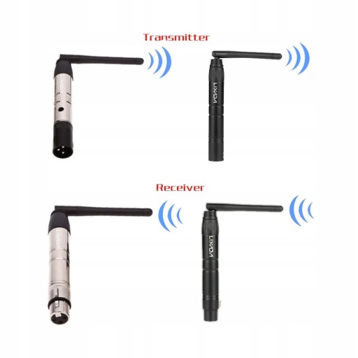 - Nadajnik bezprzewodowy DMX512 przesyła standardowe dane protokołu DMX512 (generowane przez konsolę) drogą bezprzewodową.