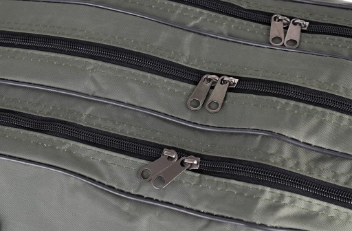 Wykonany z wysokiej jakości materiału wzmacnianego i wodoodpornego z dwustronnymi zamkami. Dodatkowo elastyczna konstrukcja za pomocą taśm węglowych i mocne suwaki. Wszystkie komory otwierane, dzięki zamkom błyskawicznym. Solidny oraz wytrzymały pokrowiec na wędki. Specjalnie wyprofilowany kształt umożliwia przewożenie wędek z zamontowanymi kołowrotkami co znacznie ułatwia i przyspiesza pakowanie. Pokrowiec posiada trzy komory na wędki oraz kieszonki boczne na dodatkowe akcesoria wędkarskie.