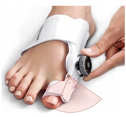 Koryguje ułożenie dużego palca stopy (leczenie zachowawcze i pooperacyjne).