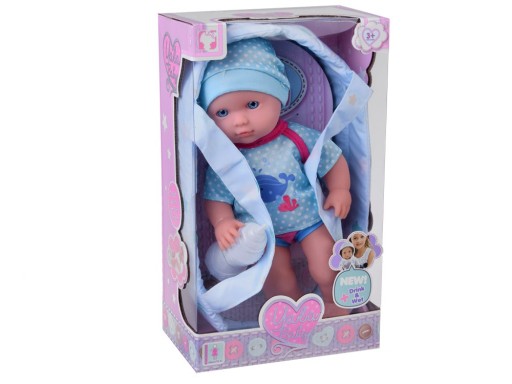 Zestaw lalka i nosidełko to idealny zestaw dla wszystkich małych mam i tatusiów. Zestaw jest idealny do podróży i spacerów. Zestaw z dodatkami to wymarzony zestaw dla każdej mamy i przyszłego rodzica. Urocza lalka z przepięknymi niebieskimi oczkami, w niebieskiej czapeczce i ubranku z delfinem. Po napojeniu jej płynem siusia. Cała lalka jest wykonana z gumy, a jej kończyny są ruchome. Nosidełko wykonane jest z wysokiej jakości materiałów. Do nosidełka przyszyte są paski ułatwiające transportowanie laleczki. Dodatkowo w zestawie znajdują się także akcesoria do karmienia dziecka. Gotowy kompaktowy zestaw idealnie wpasuje się nawet w małe pokoje dziecięce. Nosidełko jest dość duże i pomieści lalki o wzroście do 30 cm!