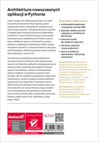 Python zyskuje coraz większą popularność i jest wykorzystywany do tworzenia bardzo różnych aplikacji, jednak projektowanie dużych, niezawodnych systemów w tym języku bywa wyzwaniem. Rozwijanie złożonych systemów o wysokiej jakości wymaga zastosowania odpowiedniej architektury. Trudno w Pythonie stosować takie wysokopoziomowe wzorce projektowe jak architektura sześciokątna, architektura oparta na zdarzeniach czy wzorce zalecane dla projektowania dziedzinowego (DDD). Sytuacji nie poprawia również to, że klasyczna literatura dotycząca metod zarządzania złożonością aplikacji zawiera przykłady kodu napisanego w Javie lub C#. Programiści Pythona często więc uznają takie książki za mało przydatne w swojej pracy.