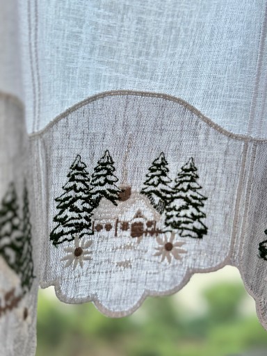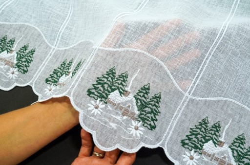 Przedmiotem sprzedaży jest biała firanka typu zazdrostka . Tkanina do złudzenia przypomina naturalny len ozdobiona haftem z motywem świątecznym zimowego domku pośród zielonych choinek.