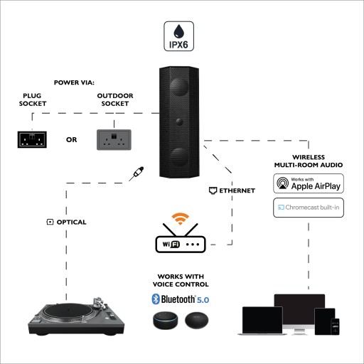 Dzięki wbudowanym funkcjom Airplay 2, Chromecast i Spotify Connect tworzenie wysokiej jakości rozproszonego dźwięku w dowolnym miejscu nie może być łatwiejsze. Głośniki z serii iO1 są również kompatybilne z dowolnym innym głośnikami Airplay 2 lub Chromecast w konfiguracji z wieloma pomieszczeniami lub wieloma obszarami. iO1 jest również wyposażony w najnowszą wersję bluetooth oferując sterowanie głosowe za pomocą Google Home i Alexa., zachowana doskonała jakoś przesyłanej muzyki dzięki częstotliwości 192kHz / 24bit, sterowanie głosowe dzięki wsparciu asystentów głosowych Alexa oraz Google.