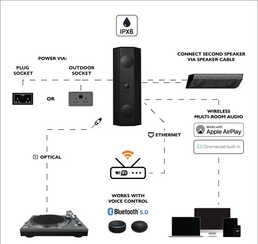Dzięki wbudowanym funkcjom Airplay 2, Chromecast i Spotify Connect tworzenie wysokiej jakości rozproszonego dźwięku w dowolnym miejscu nie może być łatwiejsze. Głośniki z serii iO1 są również kompatybilne z dowolnym innym głośnikami Airplay 2 lub Chromecast w konfiguracji z wieloma pomieszczeniami lub wieloma obszarami. iO1 jest również wyposażony w najnowszą wersję bluetooth oferując sterowanie głosowe za pomocą Google Home i Alexa., zachowana doskonała jakoś przesyłanej muzyki dzięki częstotliwości 192kHz / 24bit, sterowanie głosowe dzięki wsparciu asystentów głosowych Alexa oraz Google.