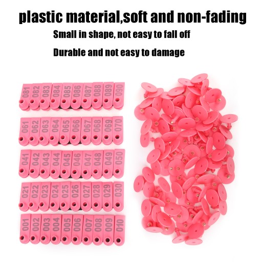 Item Type: Goat Ear Tag Material: Plastic1、The plastic material is soft ,non?fading and non?toxic, which will not affect animals' health. 2、The numbers are clear, will not fade, and are easy to identify on livestock ears. 3、This ear tag is small in shape, not easy to be bitten by livestock, and not easy to fall off. 4、Applicable to all areas of animal and livestock information management, such as epidemic prevention or control, meat isolation, etc. 5、This ear tag is hard antipyretic, durable,safe and harmless, not easy to damage.100 x Ear Tag Head100 x Ear Tag Buckle