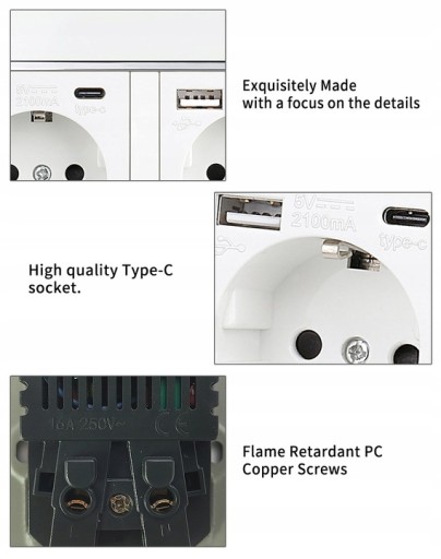 Gniazdko elektryczne 16A podwojne z 2 usb type-c