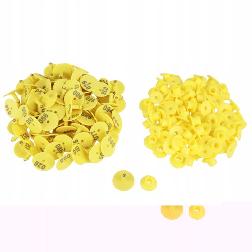 Dane techniczne: Materiał: TPU; Kolor żółty Rozmiar: 3x2,5 cm/2,0x0,7 cala (około) Numer: 100 Ilość: 1 x worek 100 sztuk kolczyków Typ: akcesoria dla zwierząt gospodarskich Funkcja: Zarządzanie informacjami o zwierzętach i inwentarzu żywym Paczka zawiera: 1 x worek 100 sztuk kolczyków
