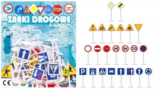 W zestawie znajdzie 21 znaków, które służą zarównodo nauki jak i zabawy. Z dziećmi można uczyć się znaków poprzez zabawę. Można stworzyć plan miasta z zabawek i na powstałych drogach poustawiać znaki, tak, aby dziecko poruszające się swoim autkiem wiedziało kiedy powinno się zatrzymać, kiedy skręcić w prawo, a w którym miejscu puścić pieszego.