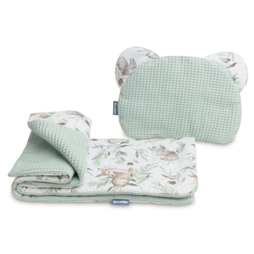 ⭐️ Zestaw Wafel do wózka składa się z poduszki (36x28 cm) i kocyka (56x76 cm). Dzięki kompaktowym wymiarom jest idealny do wózka, łóżeczka lub jako miękka mata. Wypełnienie antyalergiczne gwarantuje doskonałą izolację przed zimnem, a poduszka może pełnić funkcję przytulanki. Wykonany ze 100% bawełny, oferuje dwustronny design: z jednej strony wzór, z drugiej bawełna o strukturze wafla. ⭐️