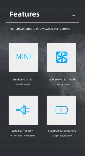 E. [Rechargeable Electric Duster] Wyposażony w port szybkiego ładowania i zmodernizowaną baterię 6000mAh, ten komputerowy odkurzacz może być szybko ładowany w ciągu trzech godzin i może działać nieprzerwanie przez 15-30 minut. Może być ładowany przez ładowarkę samochodową i moc mobilną laptopa. Lepsze doświadczenie i doskonała alternatywa dla pochłaniacza powietrza.