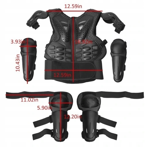 Materiał: siatka nylonowa EVA PP Dane techniczne: jeden rozmiar Rodzaj produktu: zbroja motocyklowa Klasyfikacja stylu: kask na całą twarz Pancerz zawiera jeden wierzchołek zbroi z naramiennikami oraz cztery zestawy ochraniaczy na kolana i łokcie. Waga: 0,82 kg, zestaw zbroi dla dzieci w wieku od 5 do 12 lat Rozmiar: wszystkie rozmiary Kolor: cały czarny Kamizelka pancerna: 43 cm * 33 cm, ochraniacz kolana: 31 cm * 15 cm, ochraniacz łokcia: 26.5*10 cm