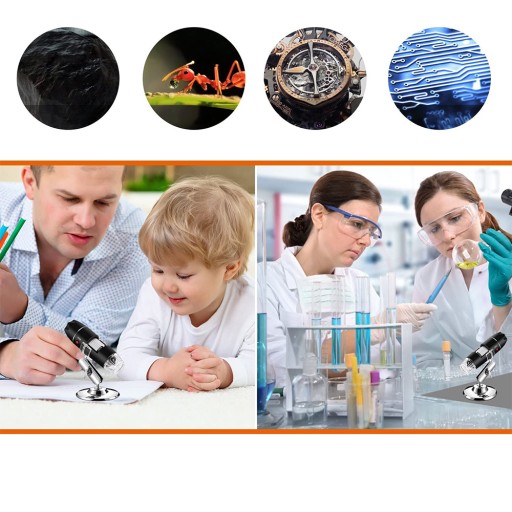 Zasilany przez USB, ten cyfrowy mikroskop jest szeroko stosowany w kolekcjach / inspekcji monet, celach edukacyjnych, badaniu skóry, badaniu włosów, rozwarstwianiu roślin, kontroli tekstyliów, kontroli biżuterii, kontroli nadruku, kontroli PCB lub PCBA i tak dalej.
