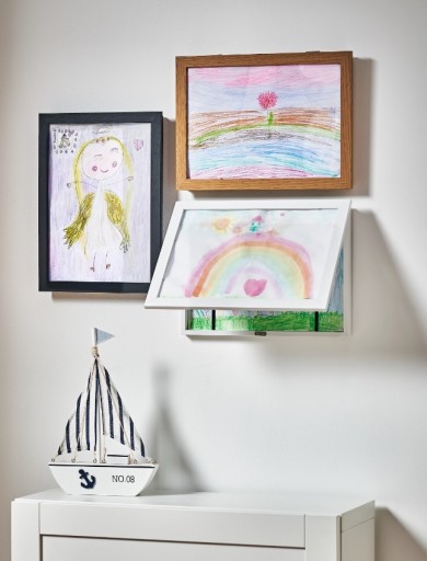 Otwierane ramki są doskonałym rozwiązaniem do przechowywania i prezentacji rysunków i prac plastycznych dzieci. Wystarczy otworzyć ramkę, umieścić obrazek wewnątrz, dwie gumki przytrzymują rysunek i zapobiegają przesunięciu. Ramka jest głęboka, pomieści wiele prac. To praktyczne i estetyczne rozwiązanie. Wszystkie rysunki w jednym miejscu, przy dwójce lub trójce dzieci, to bardzo praktyczne rozwiązanie i sposób na zapanowanie nad radosną twórczością, jednocześnie doceniając trud i wysiłek dzieci. Tym chętniej będą malować i tworzyć gdy rysunki zamiast w szufladzie znajdą się w ramce na ścianie. Otwierana ramka sprawdzi się w domu, jak również w szkole i w przedszkolu, będzie świetnym miejscem na przechowywanie prac plastycznych dzieci. Ramkę można powiesić w pionie lub poziomie.