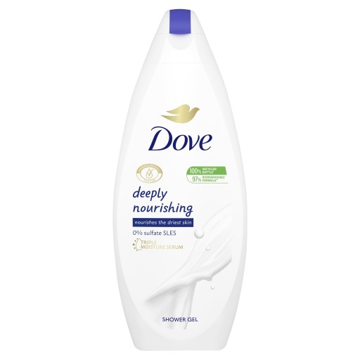Ty także pragniesz, by Twoja skóra wyglądała na zdrową i zadbaną? Wzbogać swoją codzienną rutynę pielęgnacyjną o nawilżającą formułę, dzięki której skóra zyska miękkość i uczucie komfortu. Żel pod prysznic Dove Deeply Nourishing daje Ci pewność, że odpowiednio odżywiasz swoją skórę już od samego początku dnia. Ten nawilżający żel pod prysznic łączy 1/4 kremu nawilżającego z łagodnymi substancjami myjącymi, by pomóc Twojej skórze w zachowaniu jej naturalnego poziomu nawilżenia, pozostawiając ją bardziej miękką i gładką już po pierwszym prysznicu. Pielęgnująca formuła Dove Deeply Nourishing wnika głęboko w warstwę rogową naskórka, gwarantując odpowiednie nawilżenie i odżywienie Twojej skóry. Żel tworzy bogatą pianę, która dostarcza skórze składników odżywczych, pozostawiając ją zadbaną i czystą.• Zawiera ¼ kremu nawilżającego. • Bardziej miękka i gładka skóra już po pierwszym prysznicu. • Głęboko odżywia powierzchniowe warstwy naskórka. • 100% łagodnych substancji myjących. • Łagodna, kremowa formuła delikatna dla Twojej skóry. • Oczyszczając nie narusza naturalnej bariery ochronnej skóry.