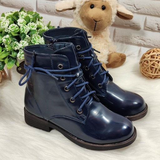 Botki dziewczęce z miękką lakierowaną cholewką. Lekko ocieplane. Od wewnętrznej strony buta suwak ułatwiający zakładanie obuwia. Wiązanie na sznurowadła umożliwia indywidualne dopasowanie do tęgości stopy. Klasyczny neutralny design, będą doskonale pasować do każdej jesiennej stylizacji.